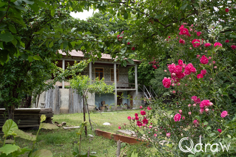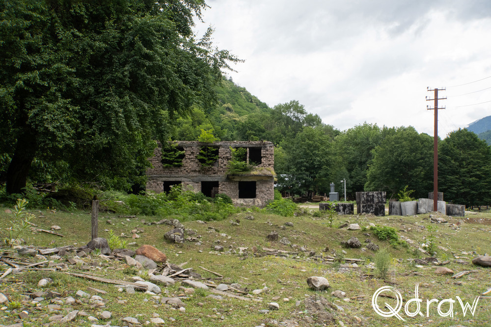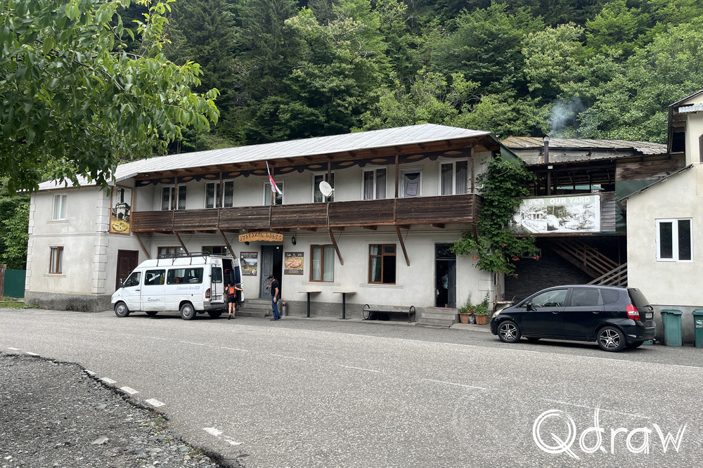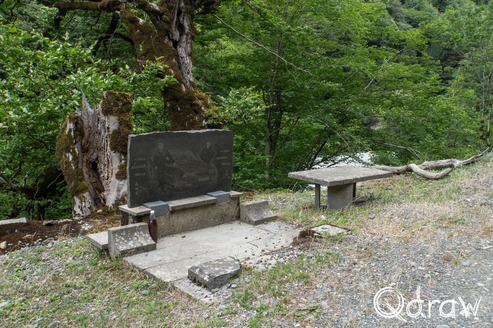 De eerste 8 km naar het begin van de Transcaucasian Trail wandel je over een grindweg die de dorpjes verbindt met de rest van het land. De dorpjes worden ook wel Chuberi genoemd. Wat opvalt, is dat auto’s hier hard rijden en dat er langs de weg graven zijn. Twee jongens waren verongelukt tijdens een rit in hun BMW, wat te zien was aan de graveringen op het graf. Ook kwam ik een oude Sovjet-truck tegen volgeladen met hout.