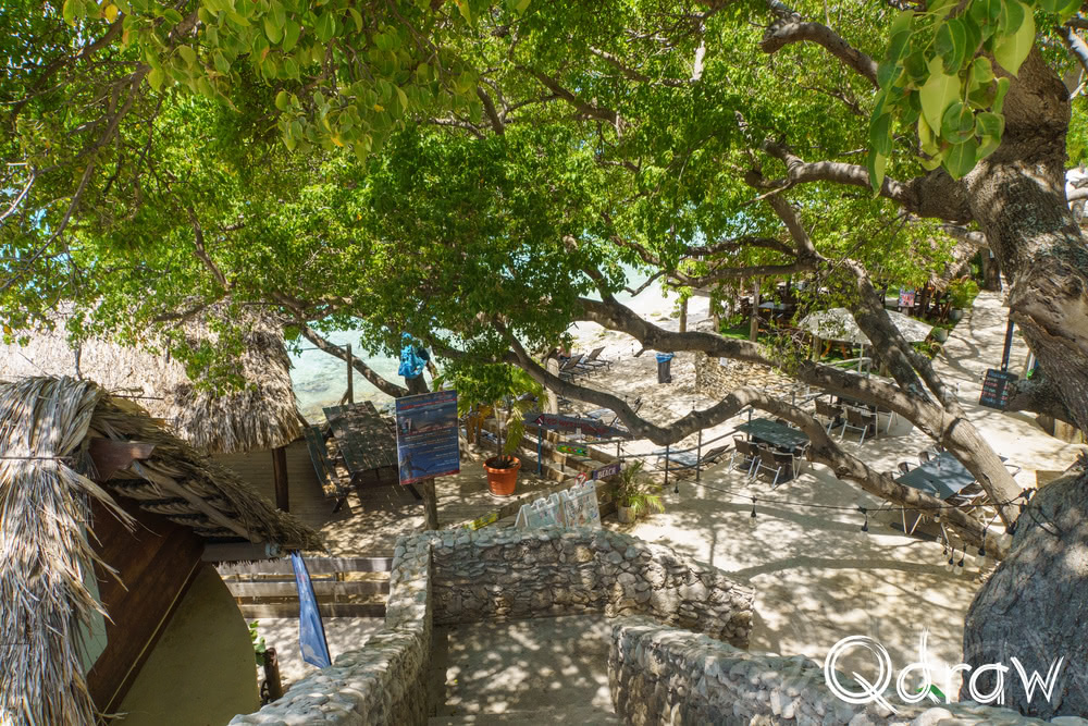 Het strand zelf is wat stenig, maar juist dat ruwe randje maakt het charmant. Er hangt een ontspannen sfeer, met hier en daar wat locals en duikers die hun uitrusting klaarmaken voor een duik naar het rif dat ze “Alice in Wonderland” noemen.