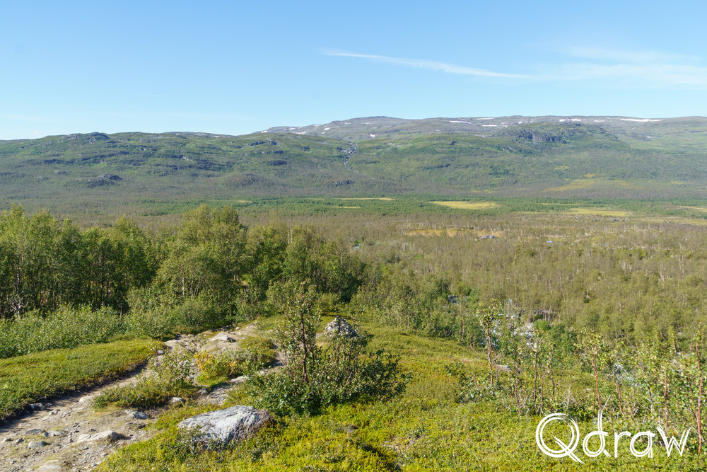 Met een brug steek je de Siellajohka rivier over en dan maak je op korte tijd een klim tot boven de boomgrens. Voorlopig zie je geen berkenbomen meer. Vanaf hier heb je een prachtig uitzicht over de Abiskojokk, dit het meer waar je eerder langs komt. Dan wandel je door een bergpas naar het volgende dal.