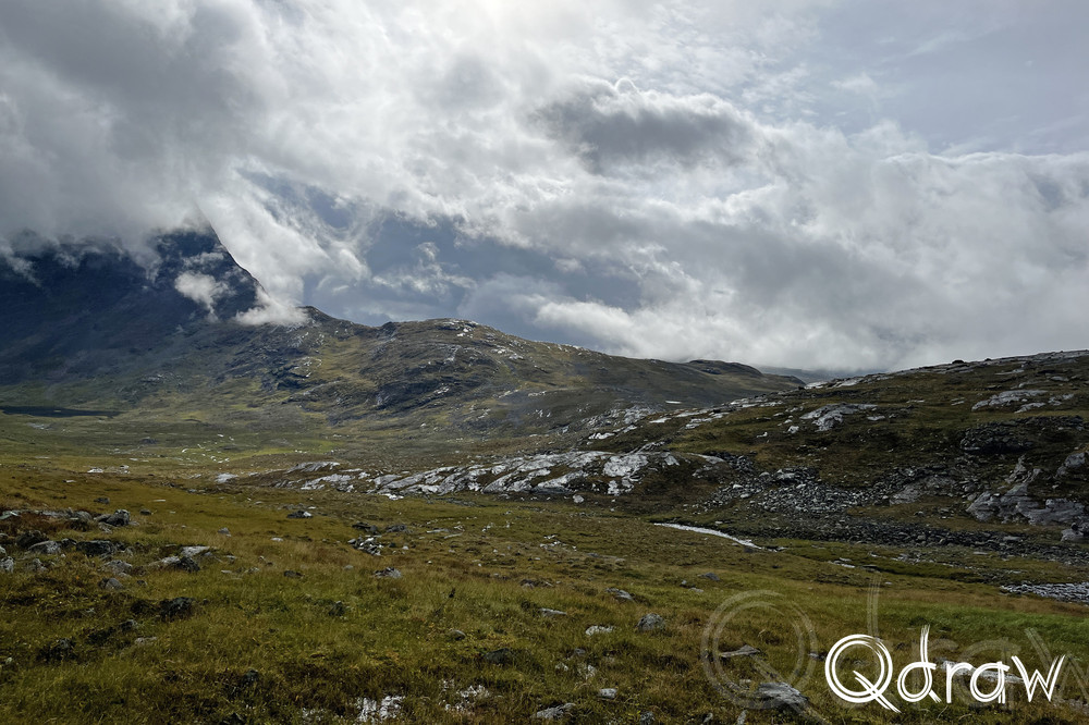De regen is opgehouden en de voorspellingen klopten dus. Ik ben vroeg opgestaan omdat het in de middag zou gaan regen. Het was bewolkt maar de wolken waren wel erg mooi. Het Taiwanese stel dat met de tent naast mij stond had het zelfde idee en was ook al druk bezig om de tent weer in te pakken. Zo ben ik de Tjaktjajakka rivier verder gevolgd. Onderweg heb ik veel rendieren gespot en je zag ook andere mensen die wild gekampeerd hadden en bezig waren op te staan. Er lopen in dit gebied veel rendieren rond. Verder zijn er in dit gebied diverse rivieren waar je door heen moet waden om deze over te steken.