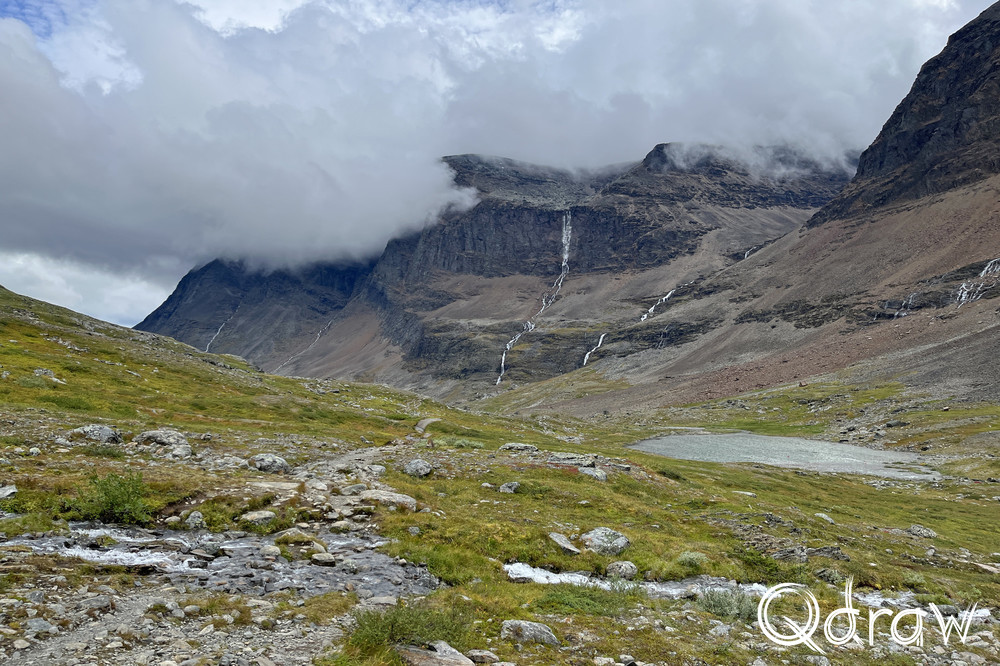 Hier kwam Anne mij achterop, deze Zweedse dame was ook alleen de Kungsleden aan het wandelen en zij stond op een keerpunt in haar leven waarin ze zichzelf de tijd had gegund om over zaken na te denken. Ze kwam uit een dorpje uit Zuid Zweden. Ze heeft in de berghutten overnacht en ging ook door naar Nikkaluokta. Heb met haar opgelopen tot de lunch, zij wilde nog voor de regen in het Kebnekaise fjällstation zijn. Dit dal heeft veel snel stromende beekjes, die bijna allemaal een doorwaadbare plaats hebben om deze over te steken.