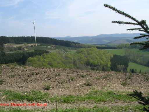 Boven op deze berg stond één windmolen, op bergen verderop stonden ook windmolens.