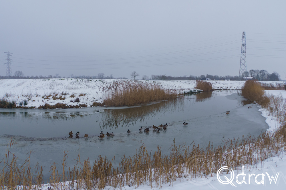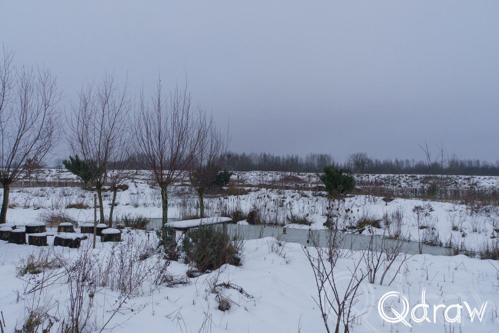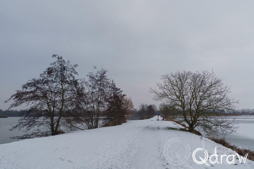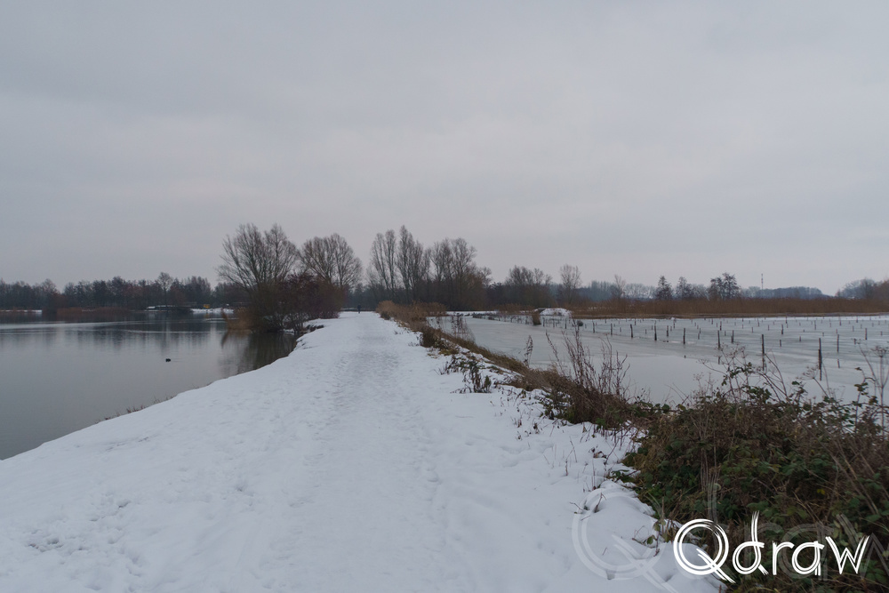 Vanaf Brasserij Bij Ons liep ik richting de Rijkerswoerdse Plassen. In de middag had de sneeuw zich al gezet: geen verse vlokken meer, maar een stabiele witte laag die het landschap samenbond. Het water lag er stil bij, deels bevroren, met dunne ijsranden langs de oevers. Vogels hielden zich rustig en het geluid van de stad leek hier volledig weg te vallen.