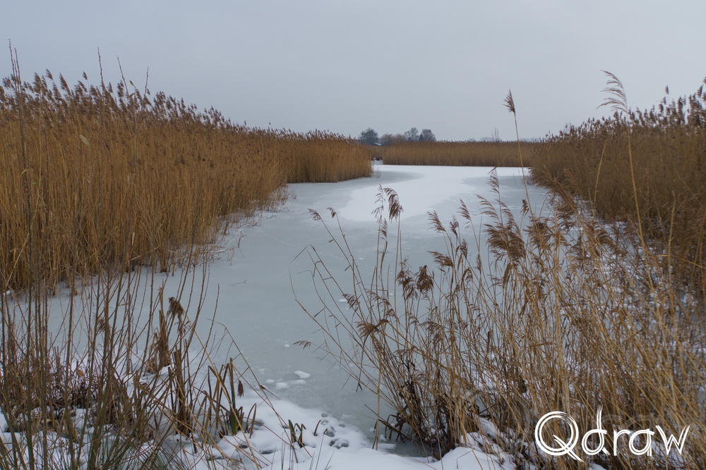 Via de plassen kwam ik in Waterrijk West, waar de rietvelden scherp afstaken tegen het wit. De paden waren goed beloopbaar, maar elke stap liet nog steeds duidelijk zijn afdruk achter. Dit deel van de route voelt open en ruim, en juist in de sneeuw komt die leegte extra sterk naar voren.