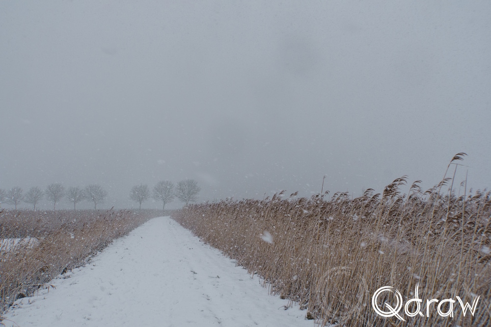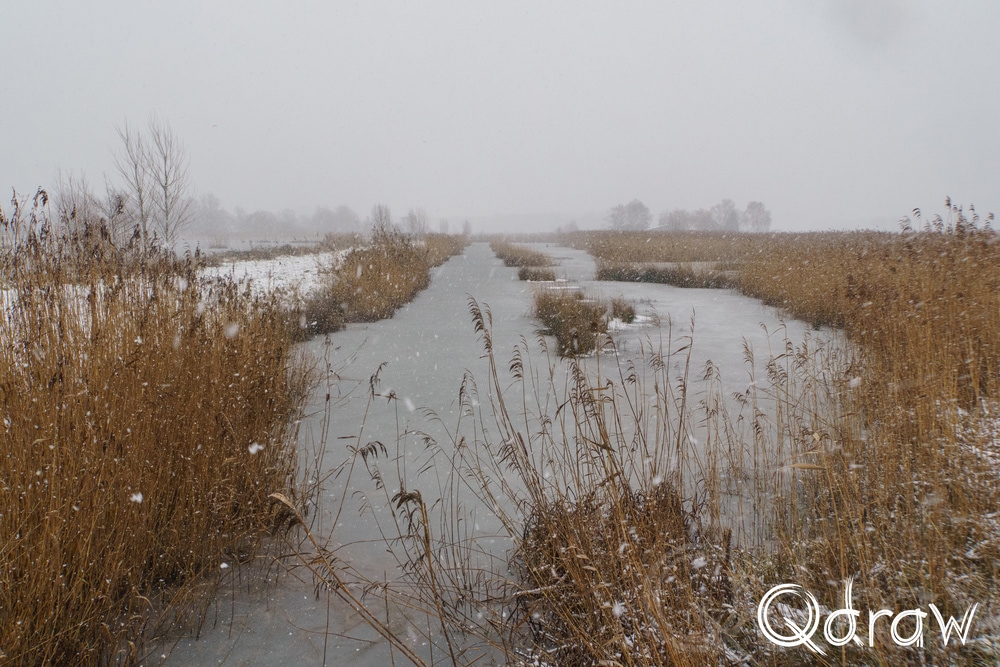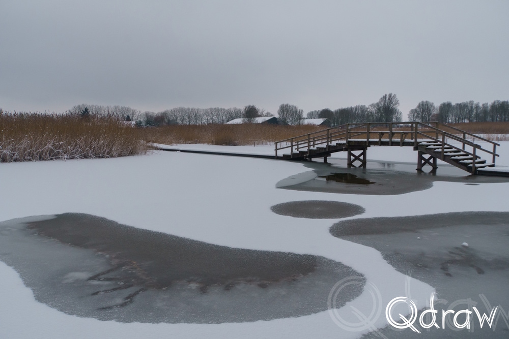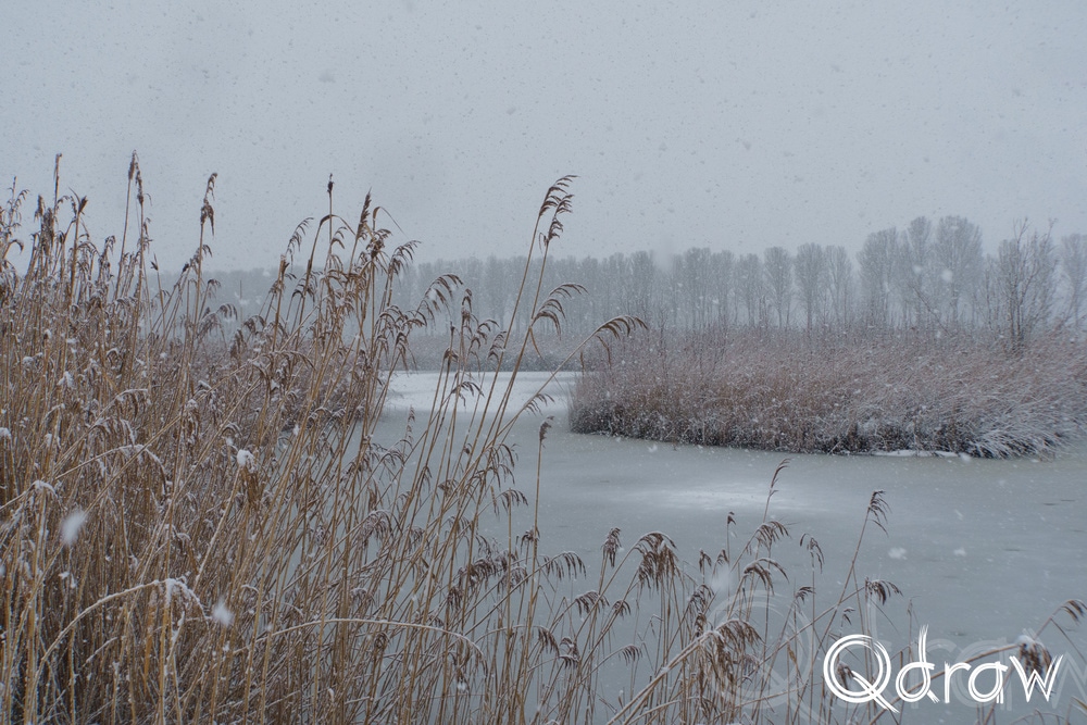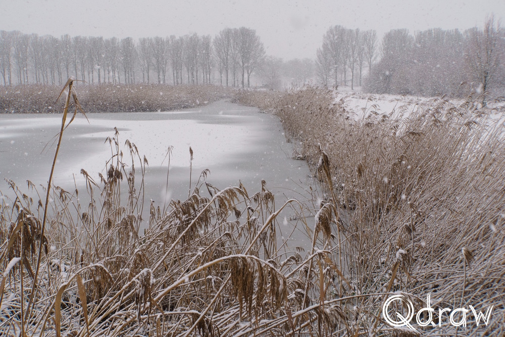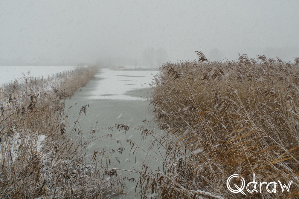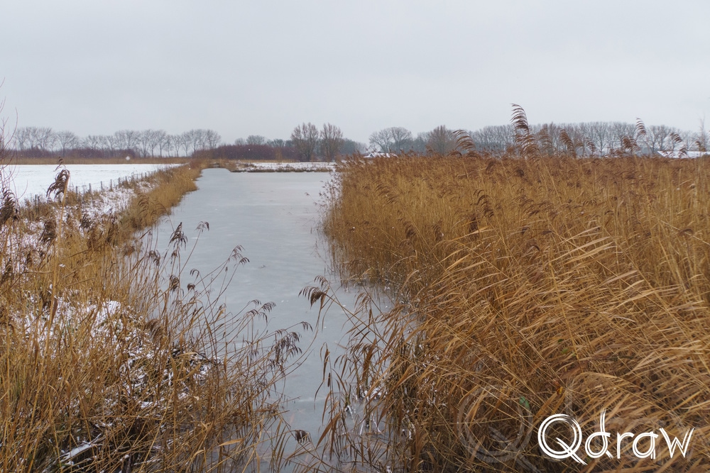 De paden waren zachter, minder scherp omlijnd. Rietkragen droegen witte randen, alsof iemand ze zorgvuldig had afgetekend. Het water lag er kalm bij, donker, bijna grafisch , met hier en daar een dunne ijsrand langs de oever. De sneeuw lag niet dik, maar precies genoeg om alles te vereenvoudigen.