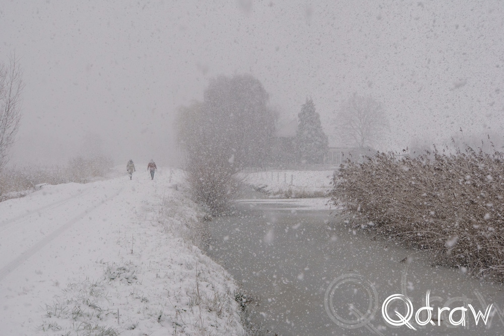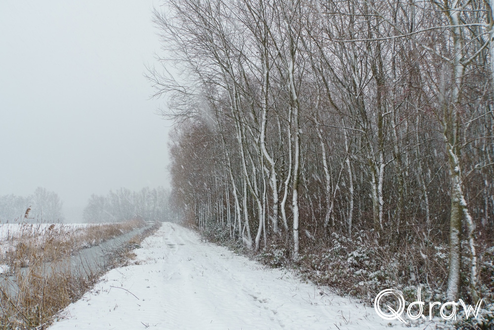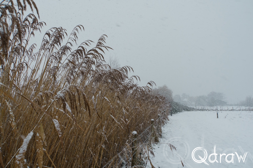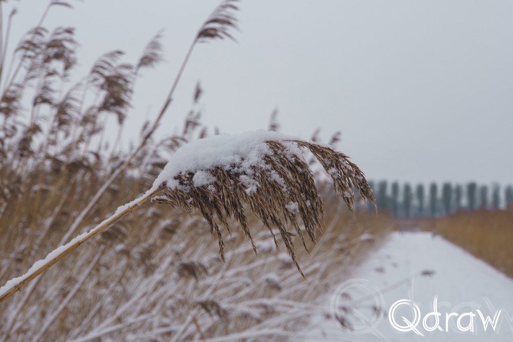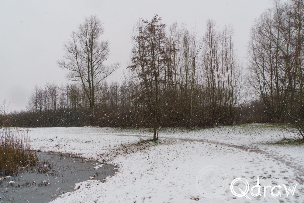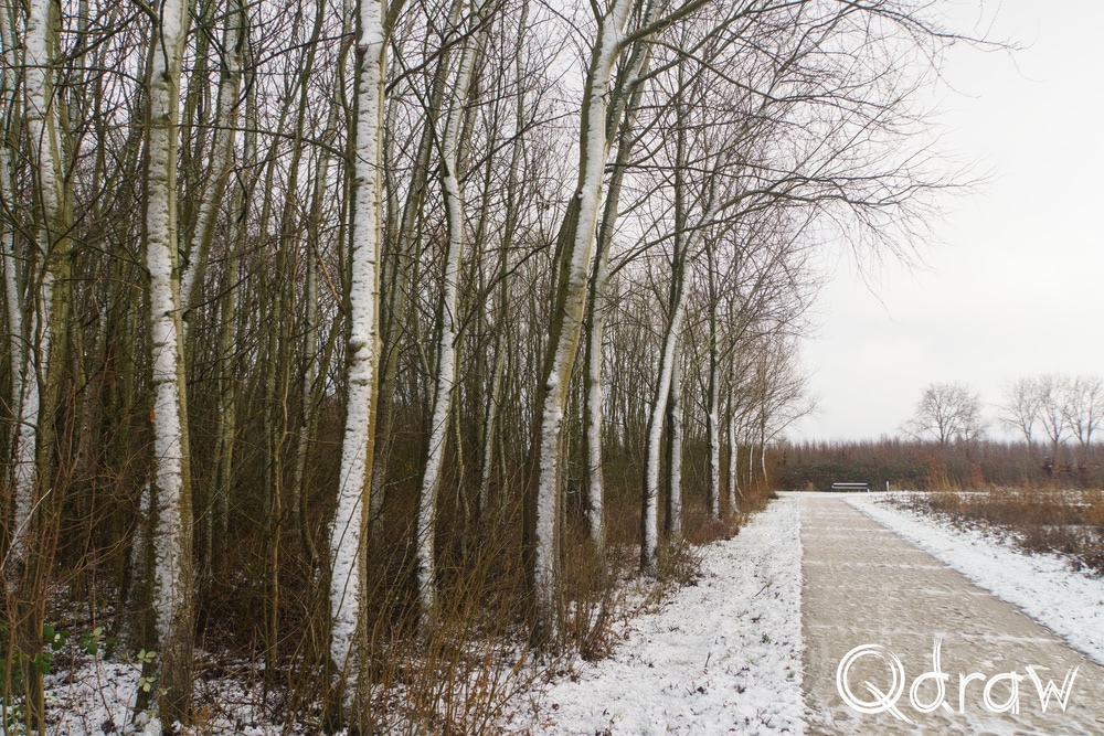 De paden waren zachter, minder scherp omlijnd. Rietkragen droegen witte randen, alsof iemand ze zorgvuldig had afgetekend. Het water lag er kalm bij, donker, bijna grafisch , met hier en daar een dunne ijsrand langs de oever. De sneeuw lag niet dik, maar precies genoeg om alles te vereenvoudigen.