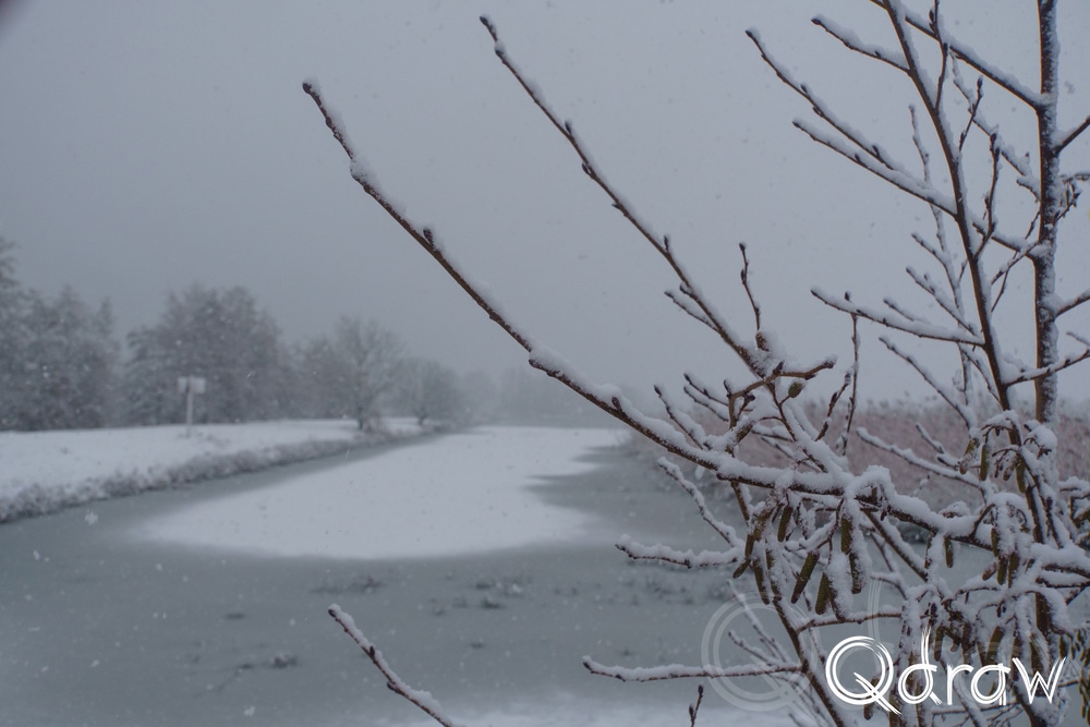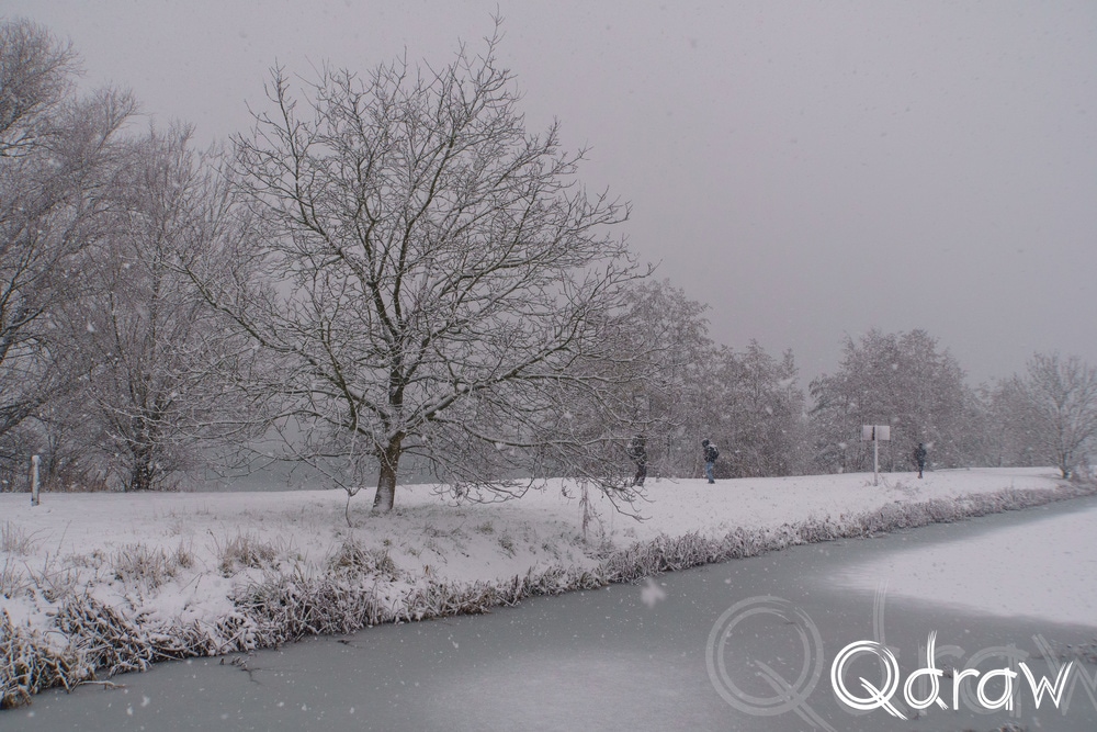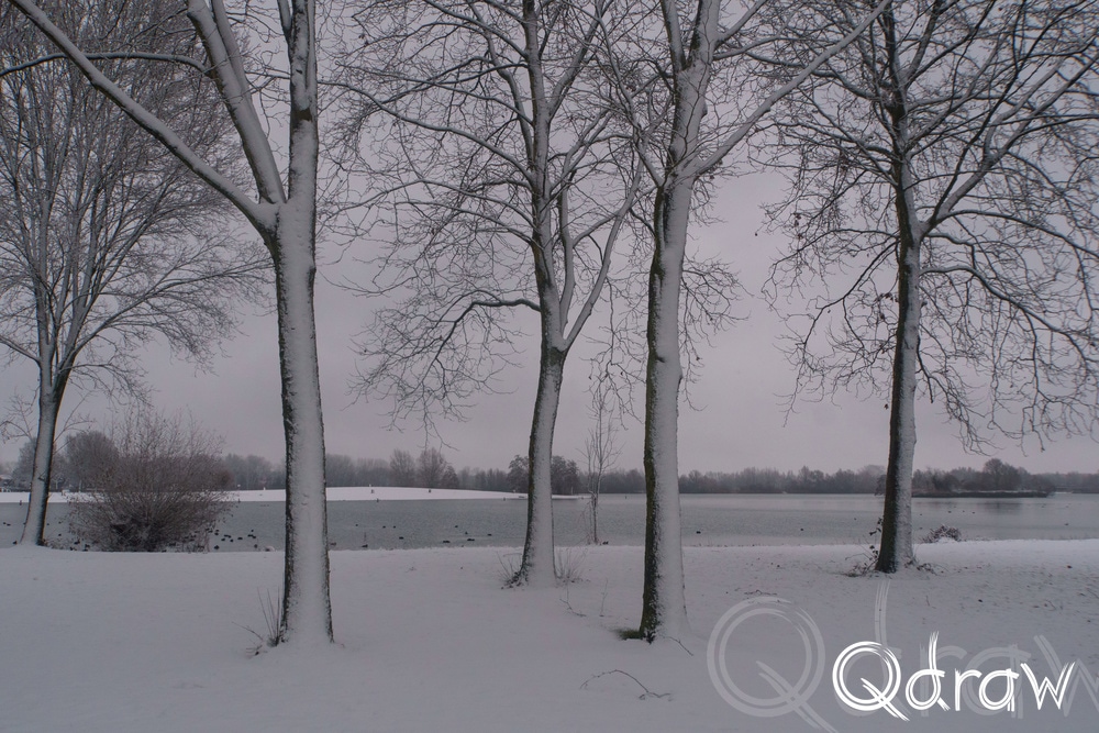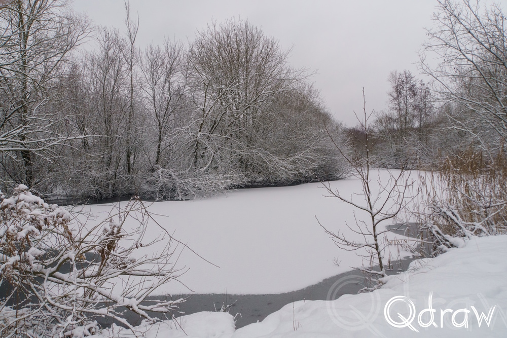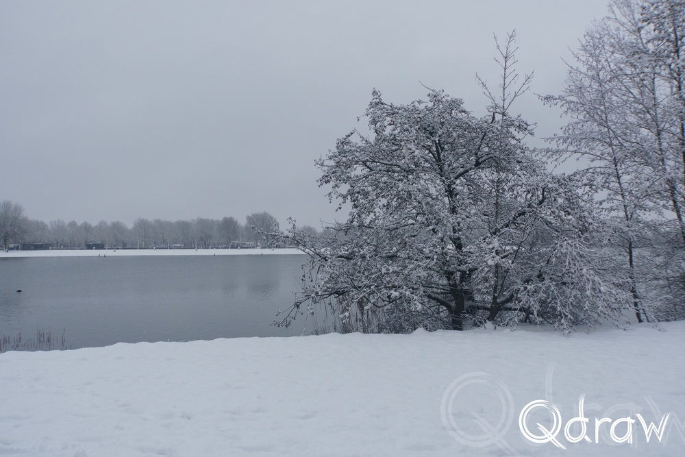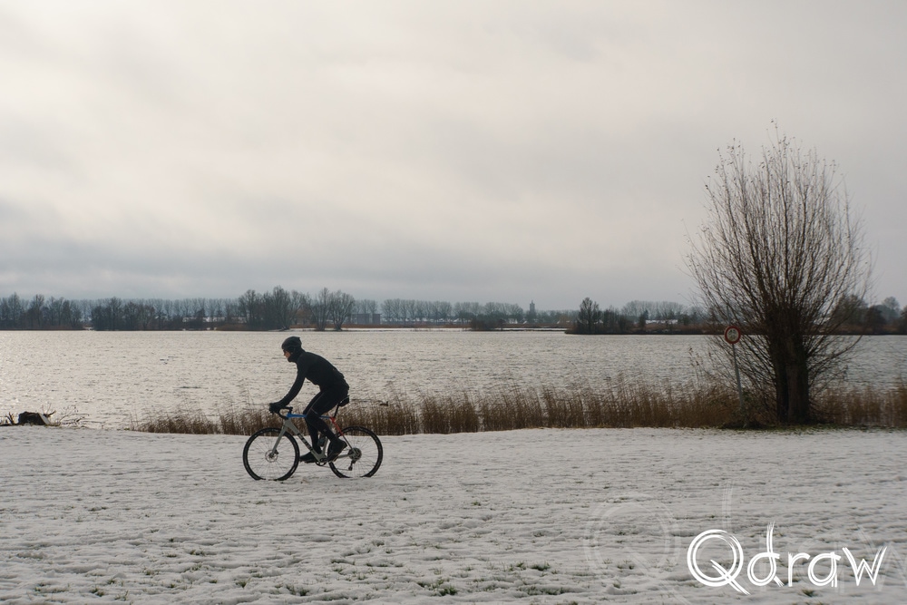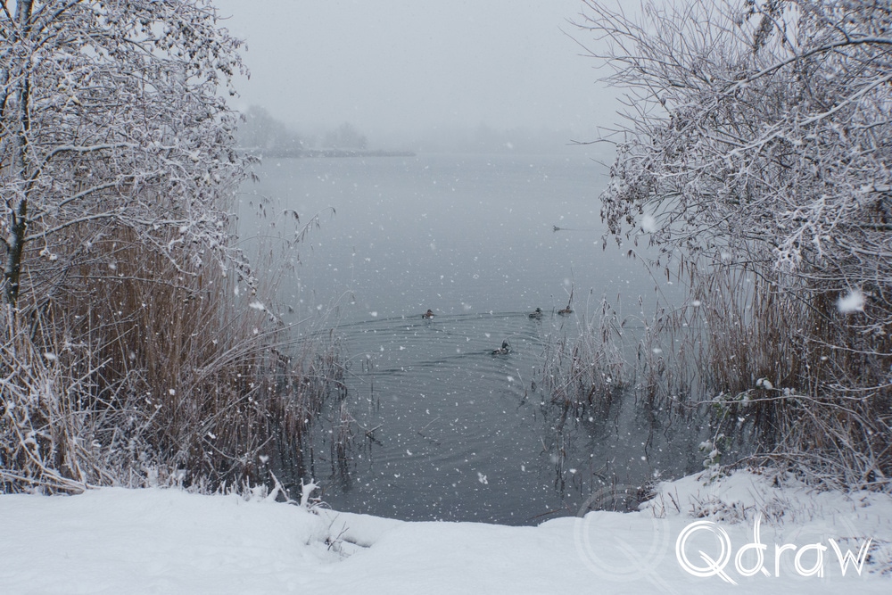 De paden waren zachter, minder scherp omlijnd. Rietkragen droegen witte randen, alsof iemand ze zorgvuldig had afgetekend. Het water lag er kalm bij, donker, bijna grafisch , met hier en daar een dunne ijsrand langs de oever. De sneeuw lag niet dik, maar precies genoeg om alles te vereenvoudigen.