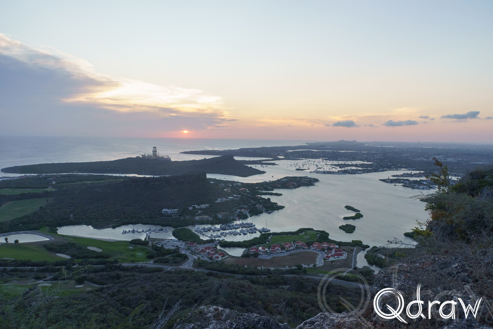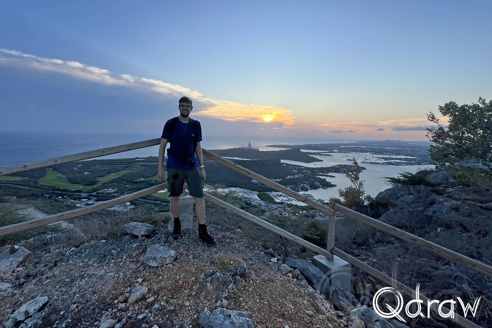 Net op tijd bereikten we de top van de Tafelberg, precies zoals beloofd — vlak voor de zon onderging. Bij het Proa-uitkijkpunt ontvouwde zich een panoramisch spektakel: een zee van oranje, roze en paars boven de zoutpannen en de Caribische kust. Iedereen werd er even stil van. Je hoort alleen het zachte ritselen van de wind door de struiken en het klikken van een paar telefooncamera’s.