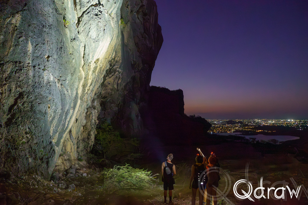 Er zijn van die momenten waarop je denkt: “Dit wordt een avontuur.” Voor mij begon dat moment toen onze gids, vijf minuten voor vertrek, het terrein van Rock Climbing Curaçao opwandelde… op Crocs. Geen stoere bergschoenen, geen stevige wandelsandalen, maar die herkenbare rubberen klompen waar je eerder een barbecue mee zou aansteken dan een berg mee zou beklimmen. We verzamelden bij de Rock Climbing Curacao (RCC)-shop, vlak bij de ingang van Santa Barbara. De zon brandde nog fel, maar er hing al dat gouden licht in de lucht dat de belofte van een prachtige zonsondergang in zich draagt. Iedereen kreeg een hoofdlampje en het advies om voldoende water mee te nemen. “Het wordt 10 kilometer, drie tot drieënhalf uur,” zei de gids met een glimlach. “Maar geen stress — ik doe dit zelfs op Crocs.” Dat laatste bleek geen grap te zijn.